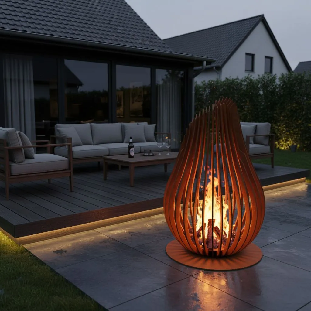 Deze imposante druppelvormige vuurkorf is een unieke stijlvolle toevoeging aan jouw tuin of terras. Met een hoogte van 46 cm en een diameter van 30 cm is het een zeer imposante vuurkorf / tuinhaard en daarmee een echte eyecatcher. Door het gebruik van duurzaam cortenstaal (Corten-A) krijgt de vuurkorf na verloop van tijd een warme roestbruine kleur. Deze laag beschermt het staal tegelijkertijd tegen verdere corrosie, waardoor de vuurkorf geschikt is om het hele jaar buiten te laten staan.